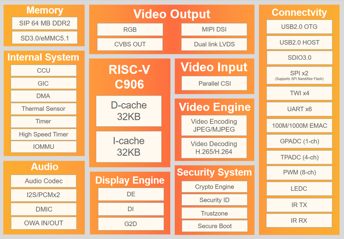 D1s 是全志针对智能解码市场推出的高性价比 AIoT 芯片。它使用 64bit RISC-V 架构的阿里平头哥 C906 处理器,内置了64M DDR2,支持 Linux 系统,同时集成了大量自研的音视频编解码相关 IP,可以支持 H.265,、H.264、MPEG-½/4、JPEG 等全格式视频解码,支持ADC、DAC、I2S、PCM、DMIC、OWA 等多种音频接口,可以广泛应用于智能家居面板、智能商显、工业控制、车载等产品。