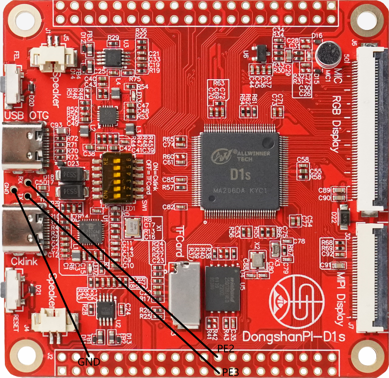 因开发板板载了CKLINK,且TF卡引脚和CKLINK冲突导致无法同时使用,需要通过拨码开关 SW1 来切换启动功能,由于我们的裸机/RTOS课程会用到CKLINK进行调试和输出功能,硬件默认把 PF2 PF4作为了UART0,但是当您使用DongshanPI-D1s运行Linux系统时,Linux系统默认的UART0为PE2 PE3 这时需要参考下图通过2.54mm规格的杜邦线连接右侧J2 排针的 PE2 PE3 GND 连接至 开发板 黑色序号 5.调试与UART功能旁边的 RX TX GND 三个圆孔内,需要直接用公头杜邦线穿过圆孔。
