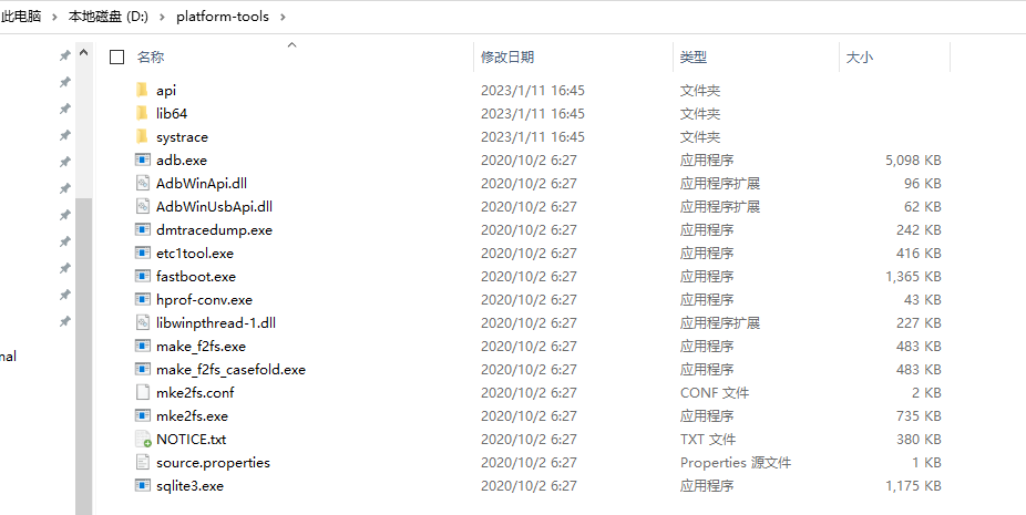 我这里是把它单独拷贝到了 D盘,我的目录是 D:\platform-tools 接下来 我需要把它单独添加到Windows系统环境变量里面才可以在任意位置使用adb命令。