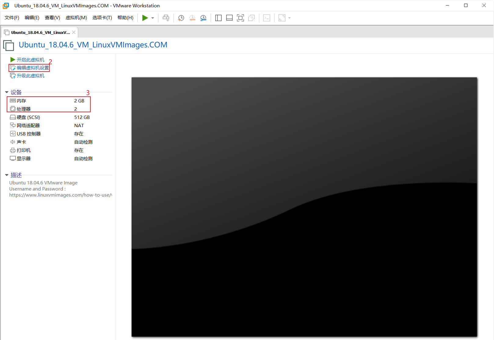 - 如下图所示为 为我们已经虚拟机的配置界面,那面我们可以 点击 红框 2 编辑虚拟机设置 里面 去调正 我们虚拟机的 内存 大小 和处理器个数,建议 最好 内存为 4GB 及以上,处理器至少4 个。 调整好以后,就可以 点击 开启此虚拟机 来运行此虚拟机了