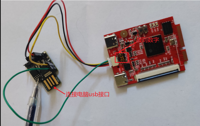 同时将烧录器和开发板烧写接口连接好,拨码开关切换为烧写模式(拨码开发白色拨码切换到非NO方向)。