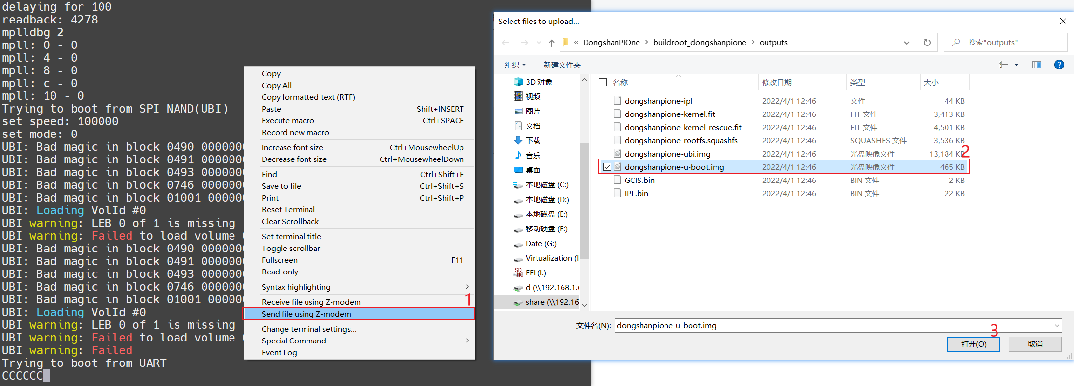 u-boot.img 也就是第二部分dongshanpione-u-boot.img发送到给 东山PI壹号的 IPL 程序,用于加载并启动进入u-boot命令行。 我们已 Mobaxterm为例,在系统启动打印 C字符串的时候,就可以参考下属操作在当前串口终端,右键 弹出菜单选项,移动到**Send file using Z-modem** 项,之后再弹出的对话框中选择要发送的 dongshanpione-u-boot.img 镜像文件,等待发送完成即可,如下图所示。