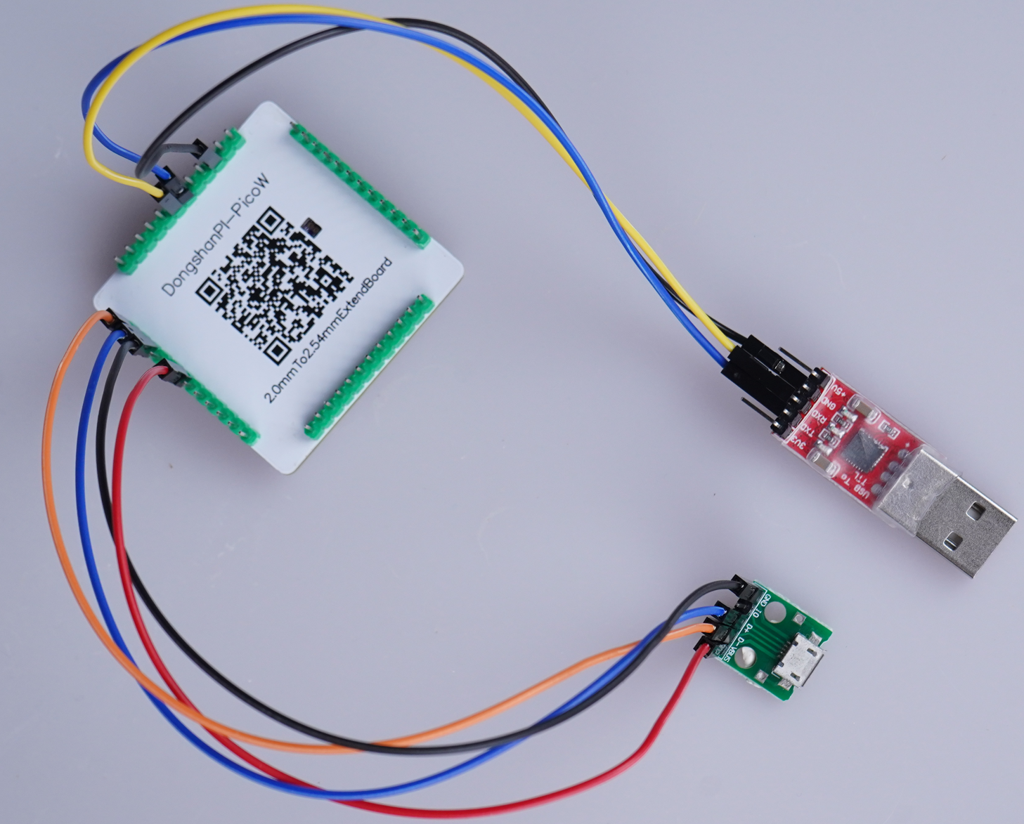 DongshanPI-PicoW属于最小开发板,可以直接使用 5V电压输入 即可开始工作,可以参考下图右侧 蓝 黄 黑 红 四个箭头所示,使用一个 Micro USB模块 分别 连接至