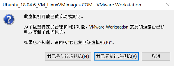 第一次打开会提示 一个 虚拟机已经复制的 对话框,我们这时,只需要 点击 我已复制虚拟机 就可以继续启动虚拟机系统了。