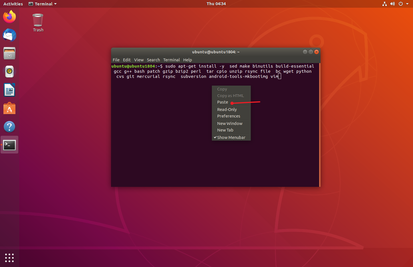 - 安装必要软件包, 鼠标点击进入 ubuntu界面内,键盘同时 按下 ctrl + alt + t 三个按键会快速唤起,终端界面,唤起成功后,在终端里面执行如下命令进行安装必要依赖包。