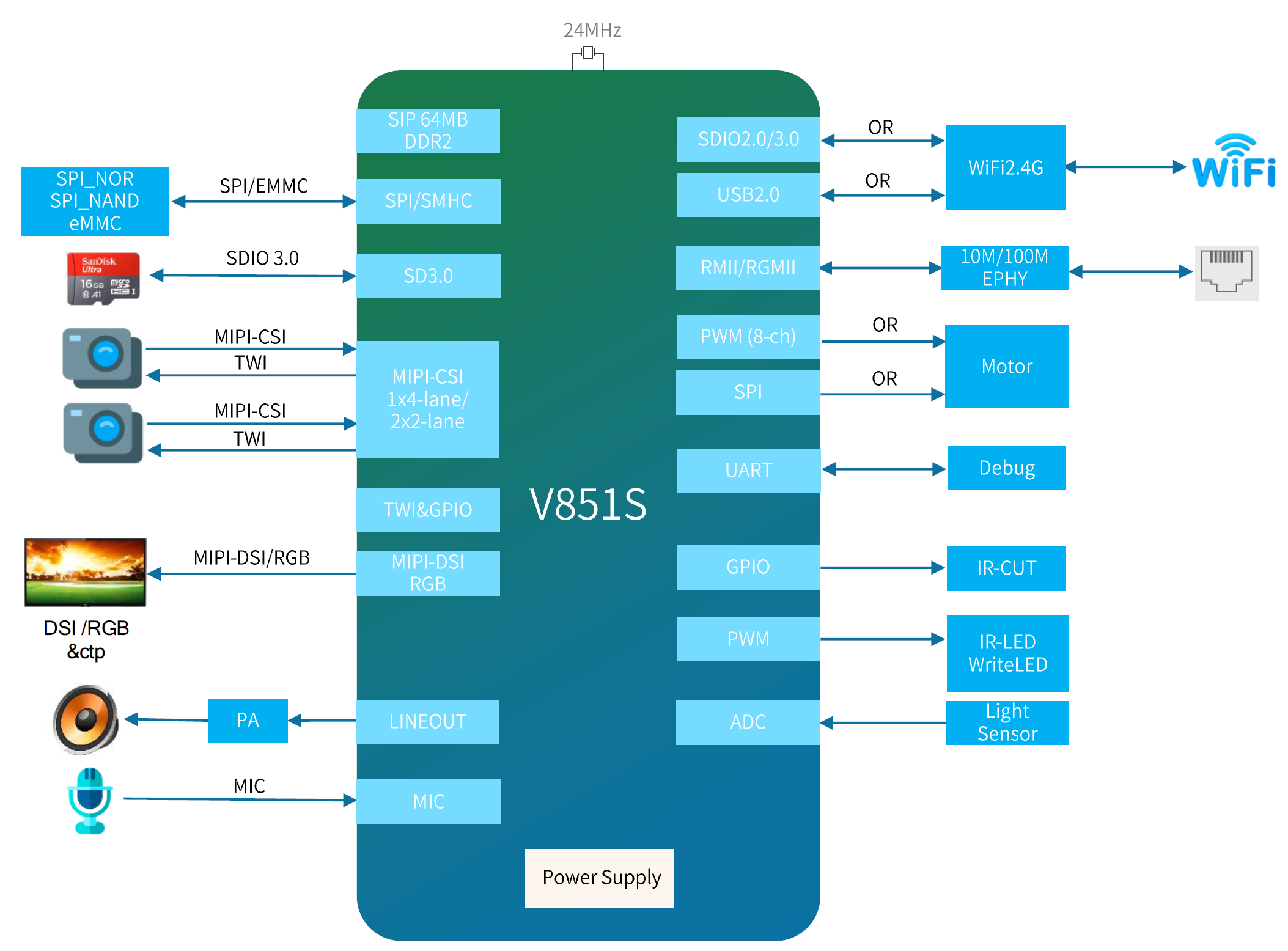 V851S拥有全新一代高性能的ISP图像处理模块及视频编码器,具备较高的编码质量、较低的编码码率和行业主流水准的图像处理能力。同时,该芯片内部集成了64MBDDR2存储器,拥有完备的应用所需外设接口,包括USB,SDIO和Ethernet等,可适用于多种网络摄像机产品。